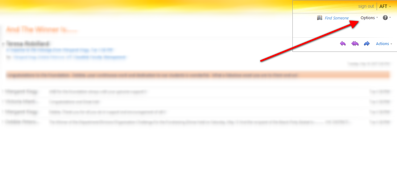 1. After logging into your VVC OWA inbox, click on the “Options” drop down menu located at the top right hand corner of the screen